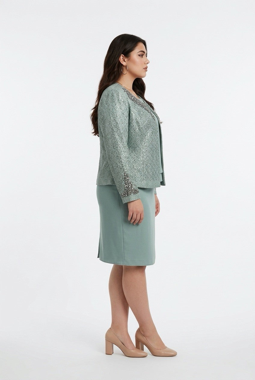 215 3-Piece Mint Green Skirt Suit – Premium Crepe & Crystal-Embellished Brocade (Plus Size)